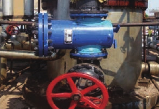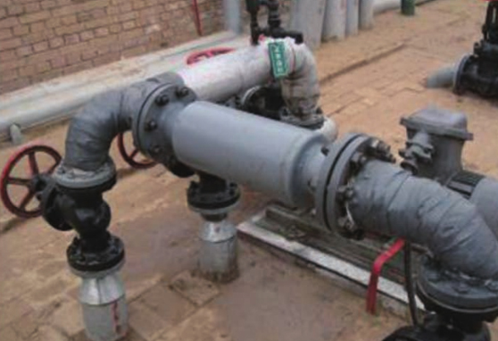 2019年6月在采卤厂一新建注水 罐出水口处安装了一台纳米合金防垢器。设备现正常运行,注水泵及管道 无水垢生成,对设备、管道的结垢问题起到了预防效果。
