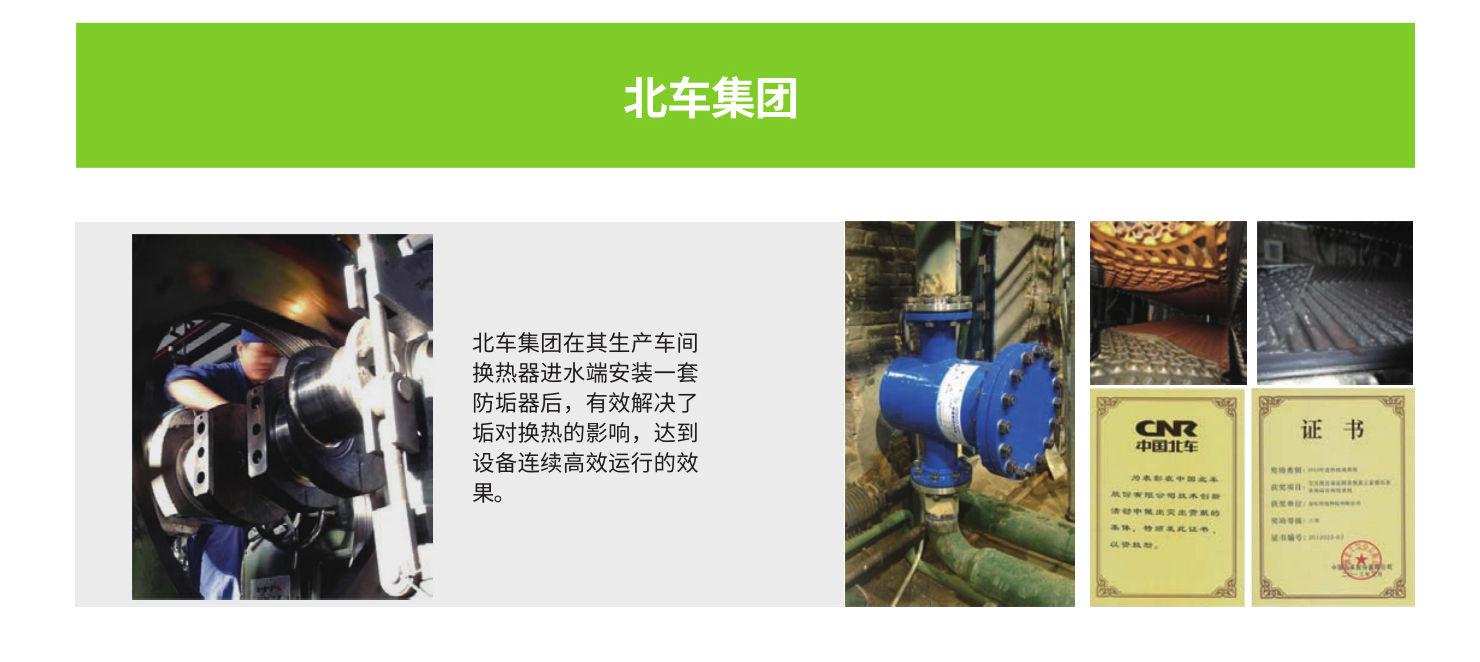 北车集团在其生产车间换热器进水端安装纳米合金防垢器